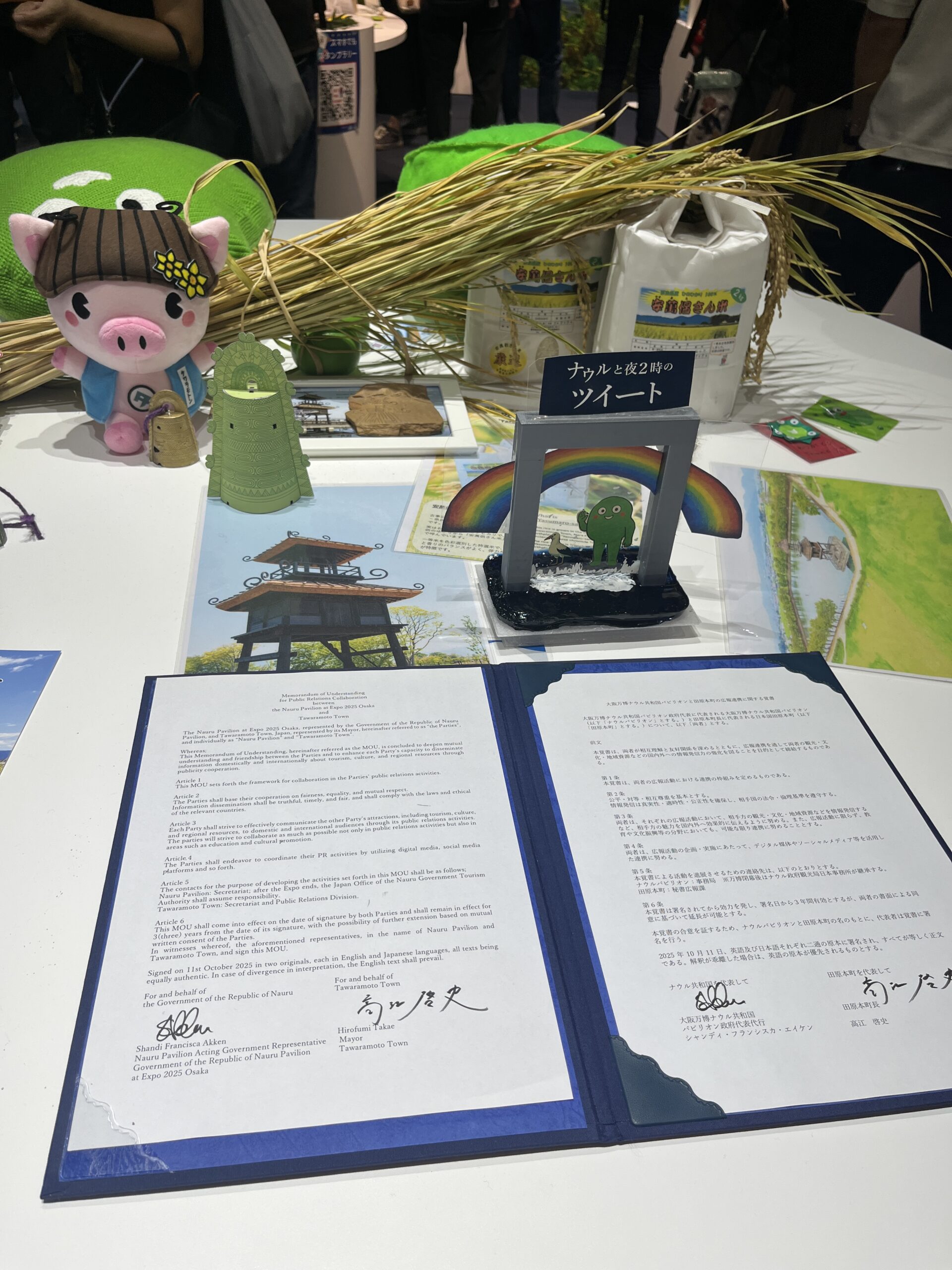 先日、奈良県の田原本市と広報連携協定を結びました。万博には、その協定書と田原本市のお米、唐子遺跡のパンフレットなどが掲載されていました。