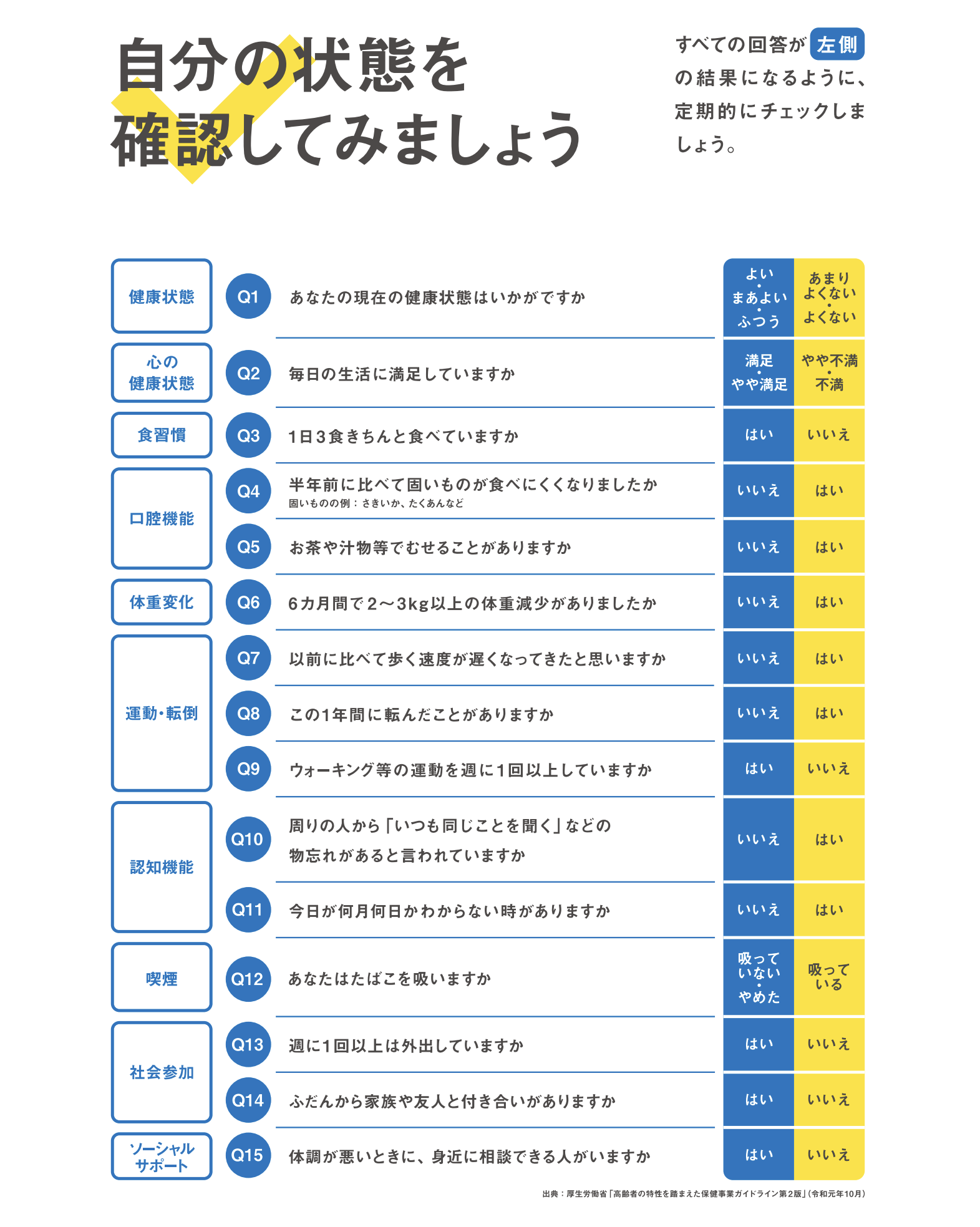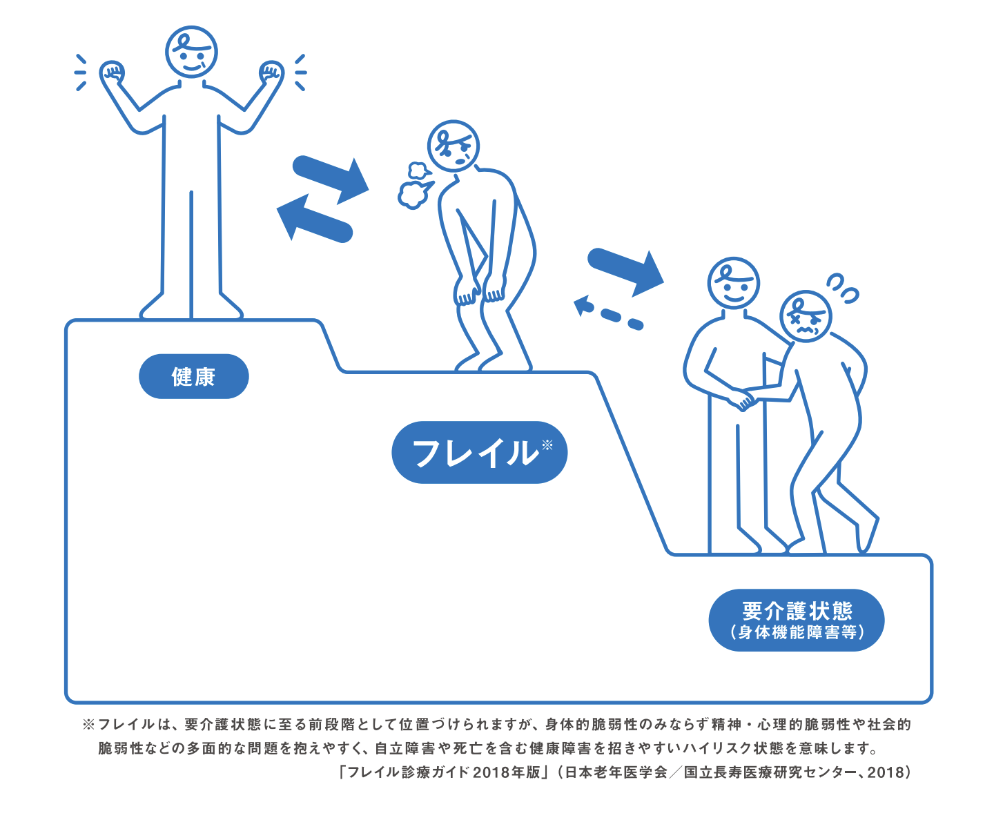 フレイルとは、加齢によって心身の機能が低下し、健康と要介護状態の中間にある「虚弱」な状態です。身体的な衰えだけでなく、気力の低下といった精神的なものや、社会的なつながりの減少も含まれます。ほっておくと要介護状態に陥ることも。運動機能などは、40歳から衰えていきます。早期に対策をすることで回復につながることもあります!年齢を重ねても元気に働けるように予防策をご紹介します!