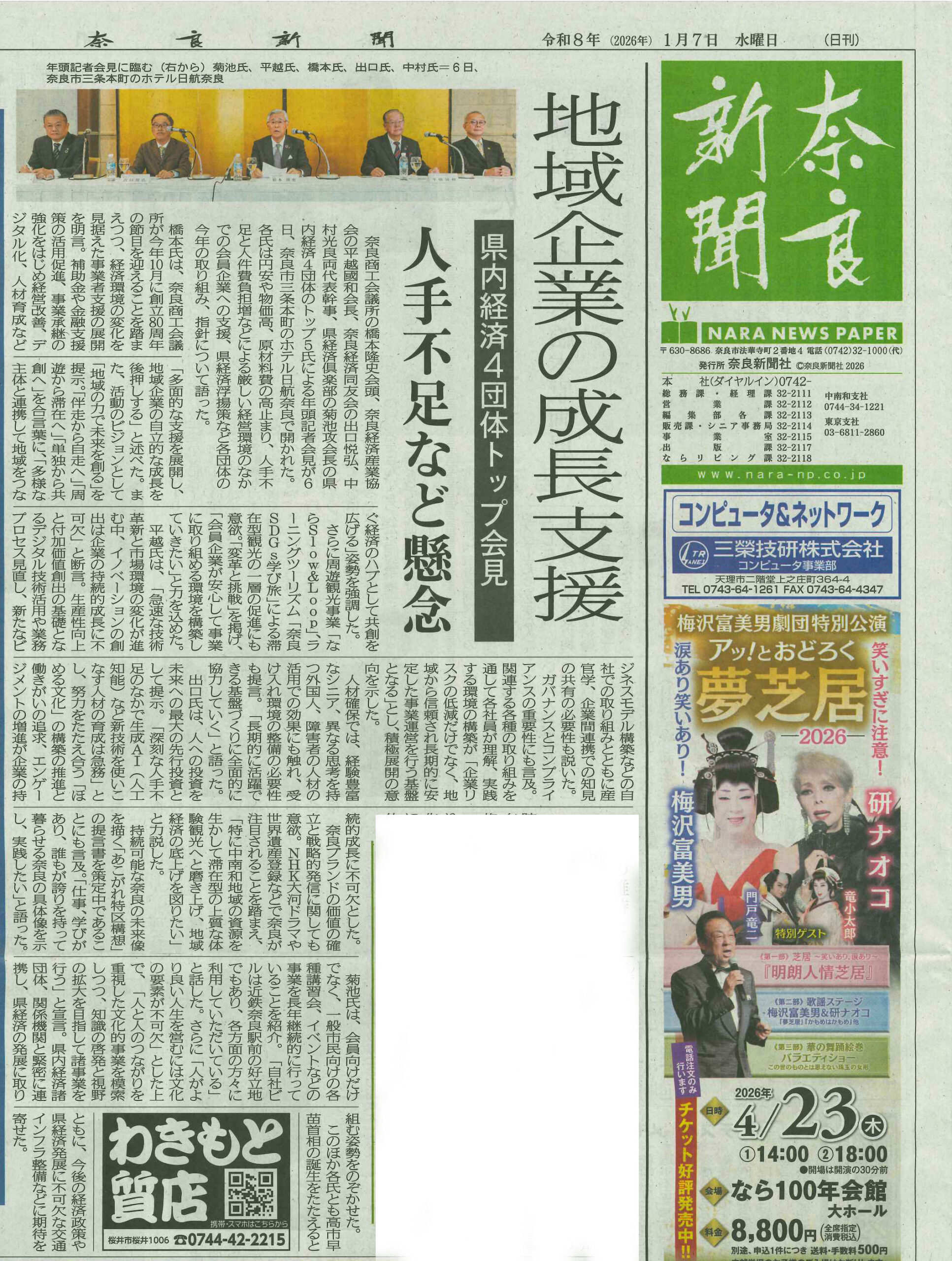 2026年1月6日(火)に奈良商工会議所、(一社)奈良経済産業協会、奈良経済同友会、(一社)奈良県経済倶楽部が合同の新年名刺交換会が行われました。それに先立ち、4団体の代表が年頭記者会見に臨み、弊社の中村光良社長も奈良経済同友会の代表幹事として登壇しました。