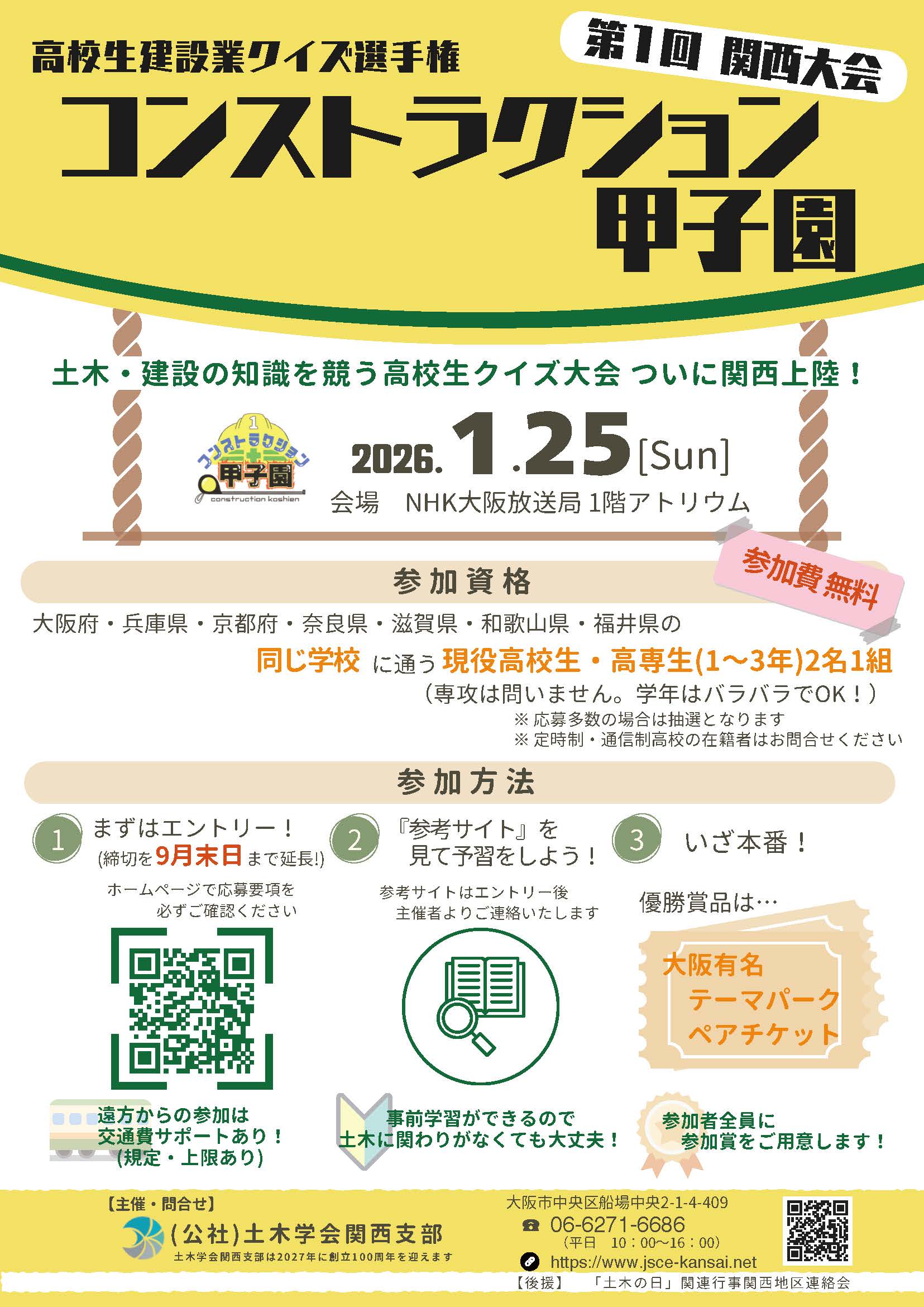 関西で初開催となる、高校生建設業クイズ選手権が行われます!このクイズ選手権は建設業にまつわる知識や時事問題をあらそうもの。建設業、防災、環境問題などに関するクイズで、建設業界に関心を持ってもらったり、防災リテラシーを高めてもらうことを目的に行います。