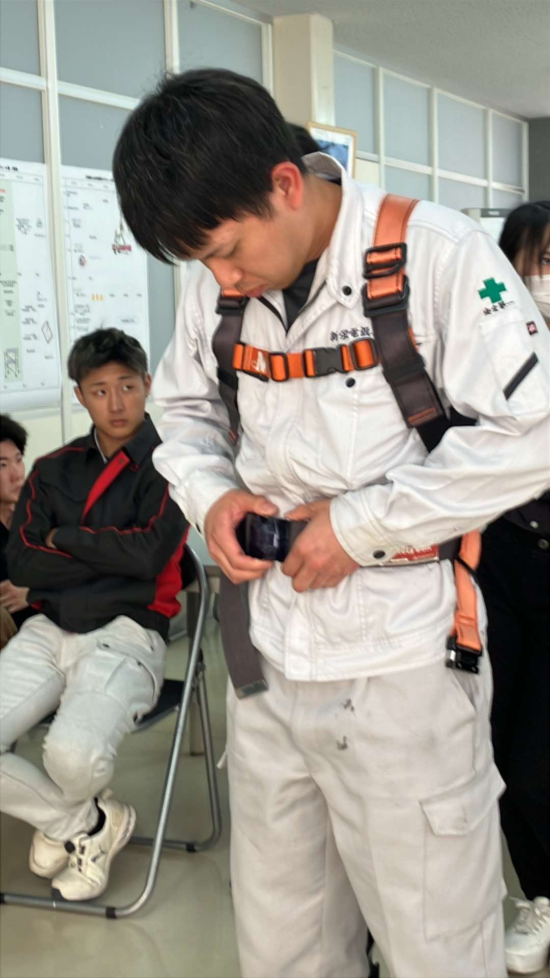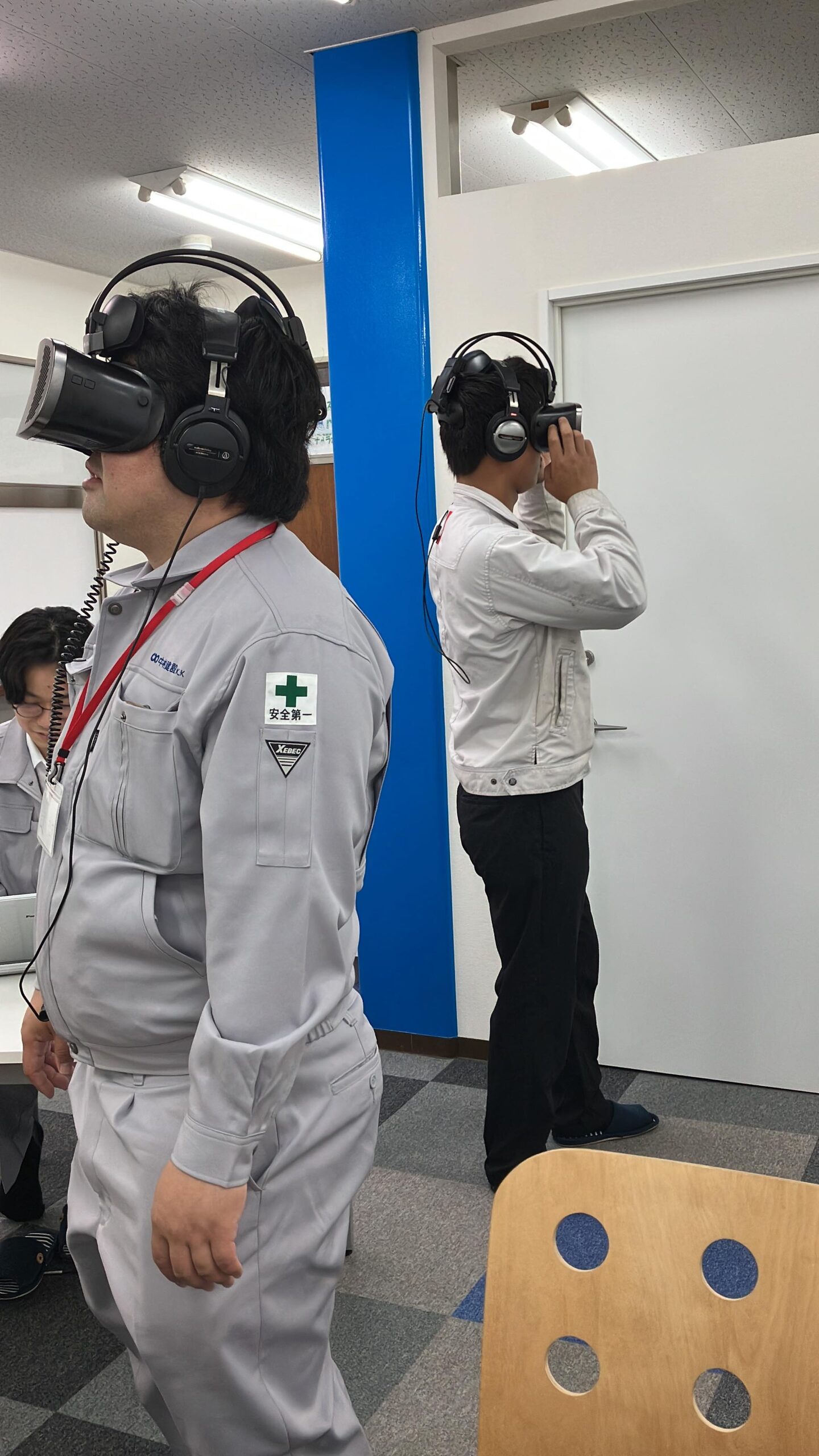 2025年の研修では、フルハーネス型安全帯の講習に加え、KY講習(資料を見て危険箇所を考える)とVRによる墜落災害の模擬体験を実施。