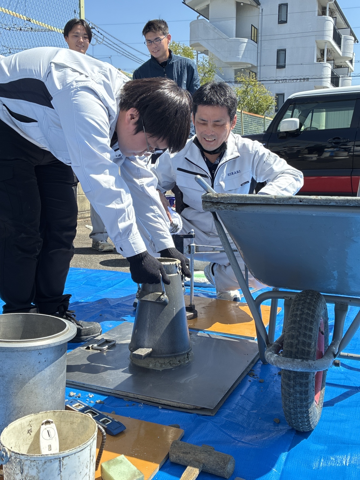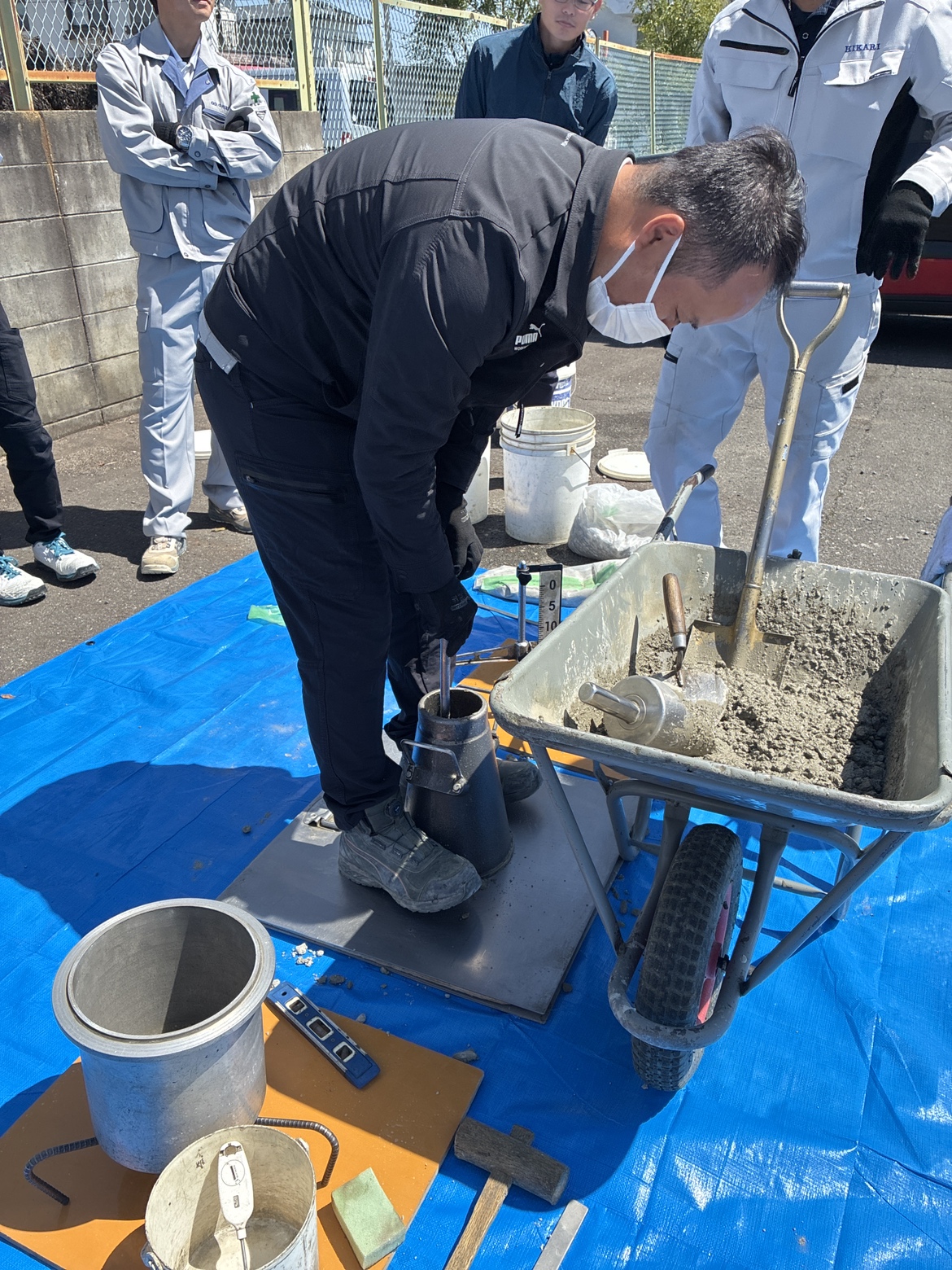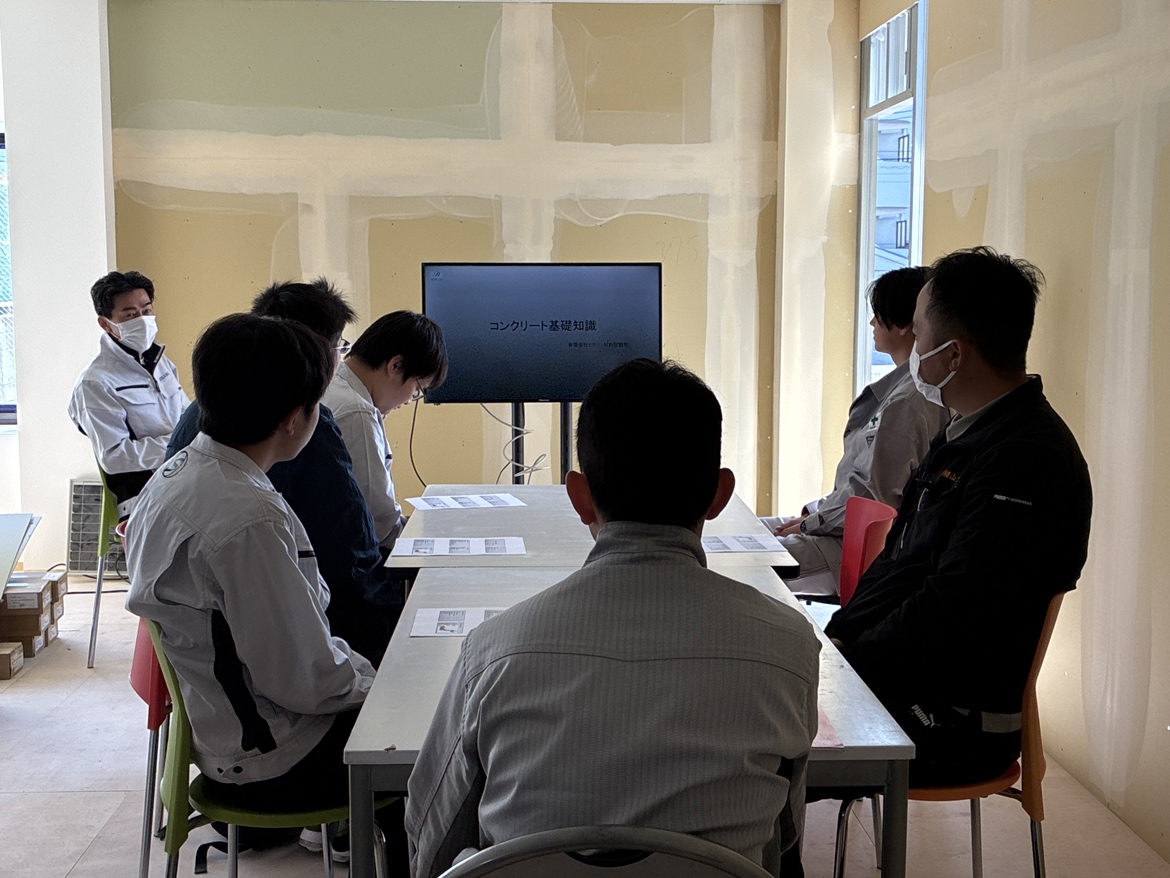 研修では実際に材料を混ぜてコンクリートをつくり、試験を実施。強度試験などを体験しながら、コンクリートの奥深さと重要性を学びました。
