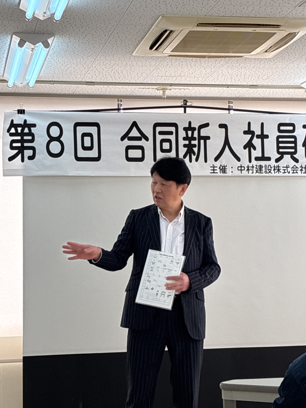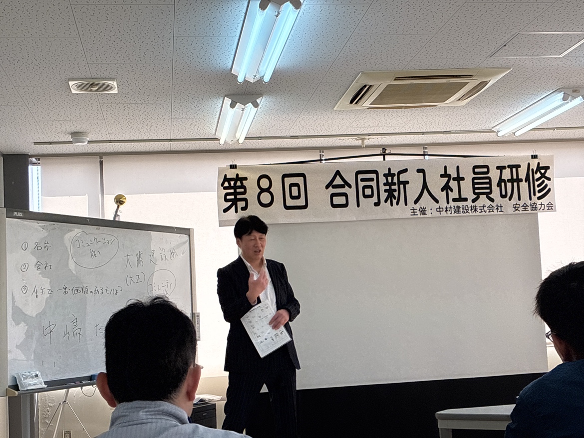 まず、大勝建設株式会社 代表取締役の中嶋氏より、新入社員がこれから身を置く「建設業界」について、仕事の魅力ややりがいをお話しいただきました。