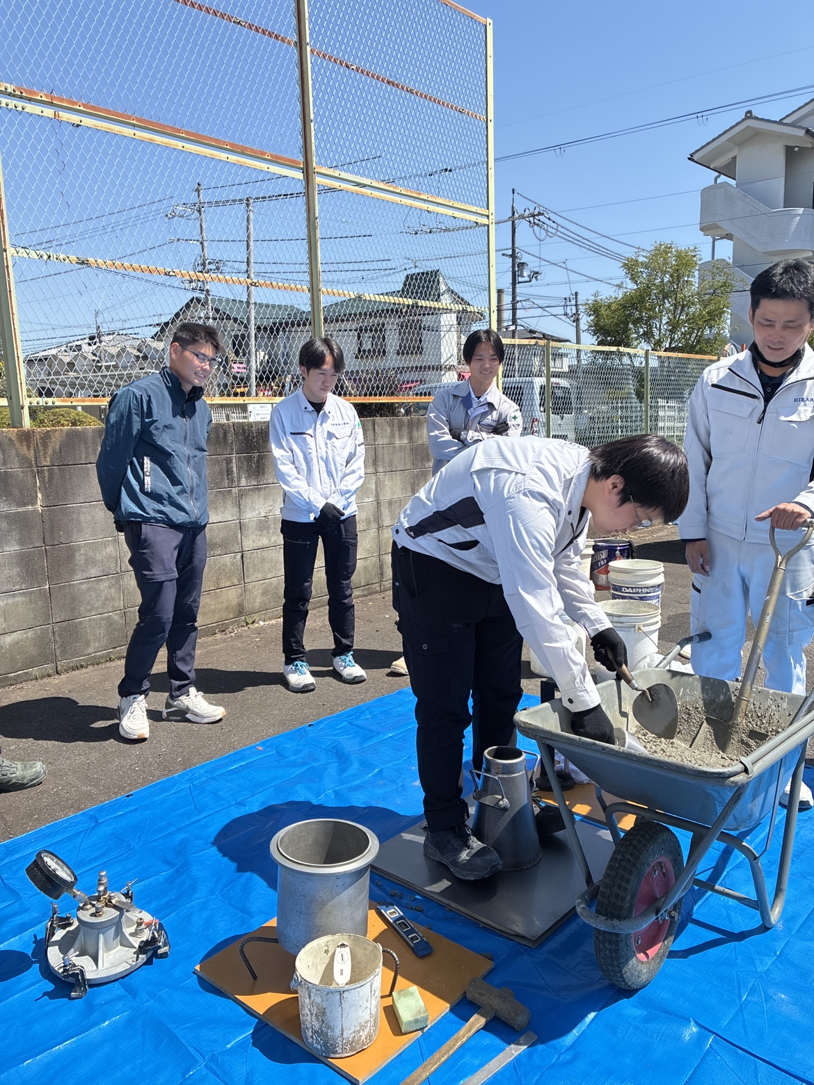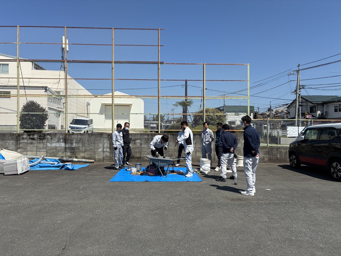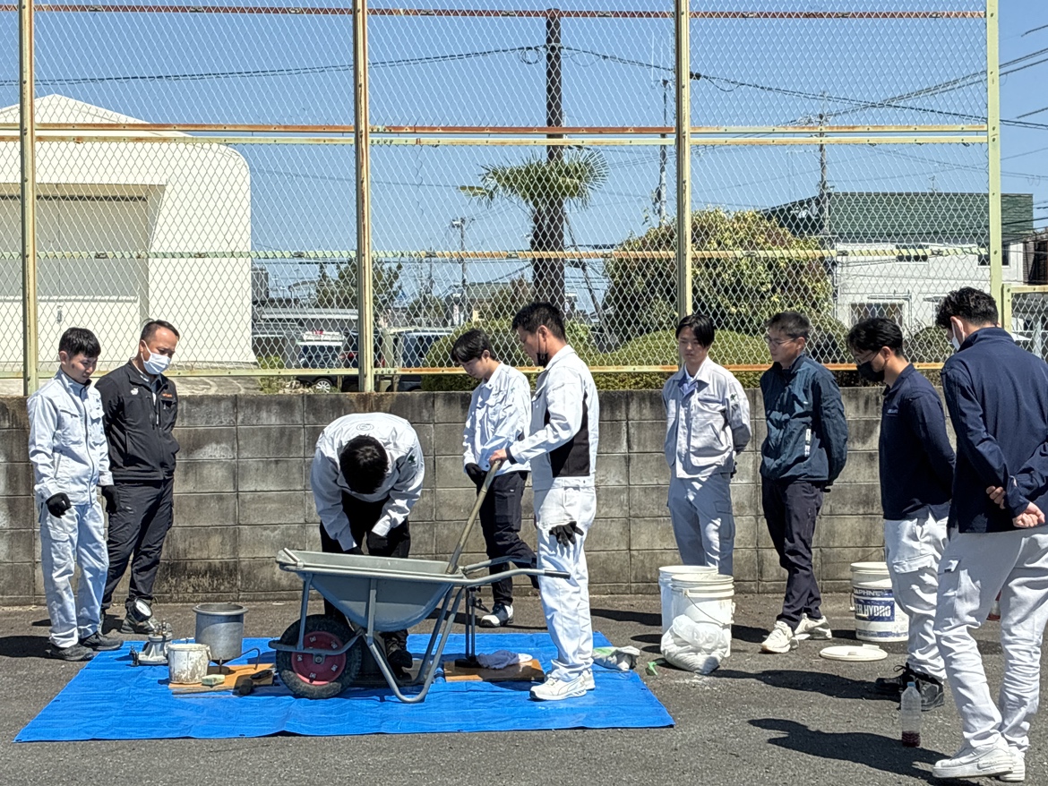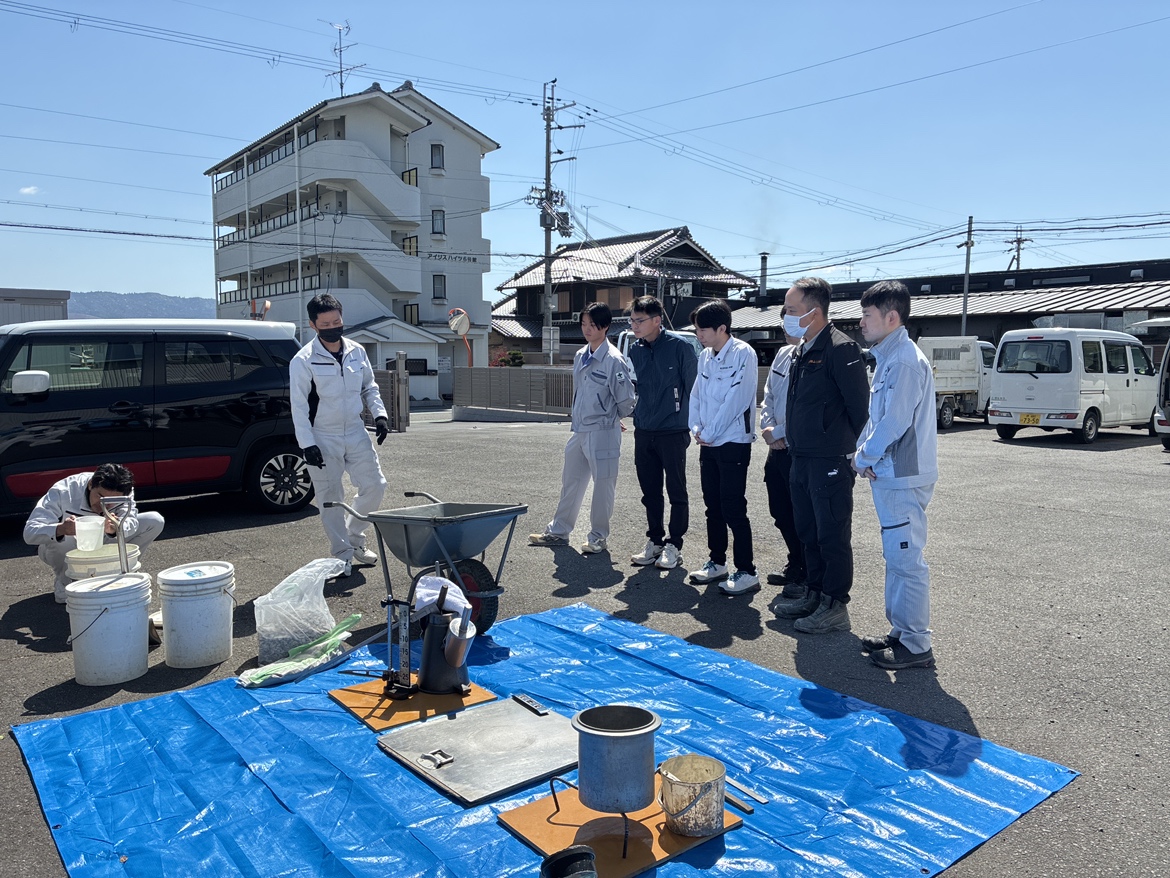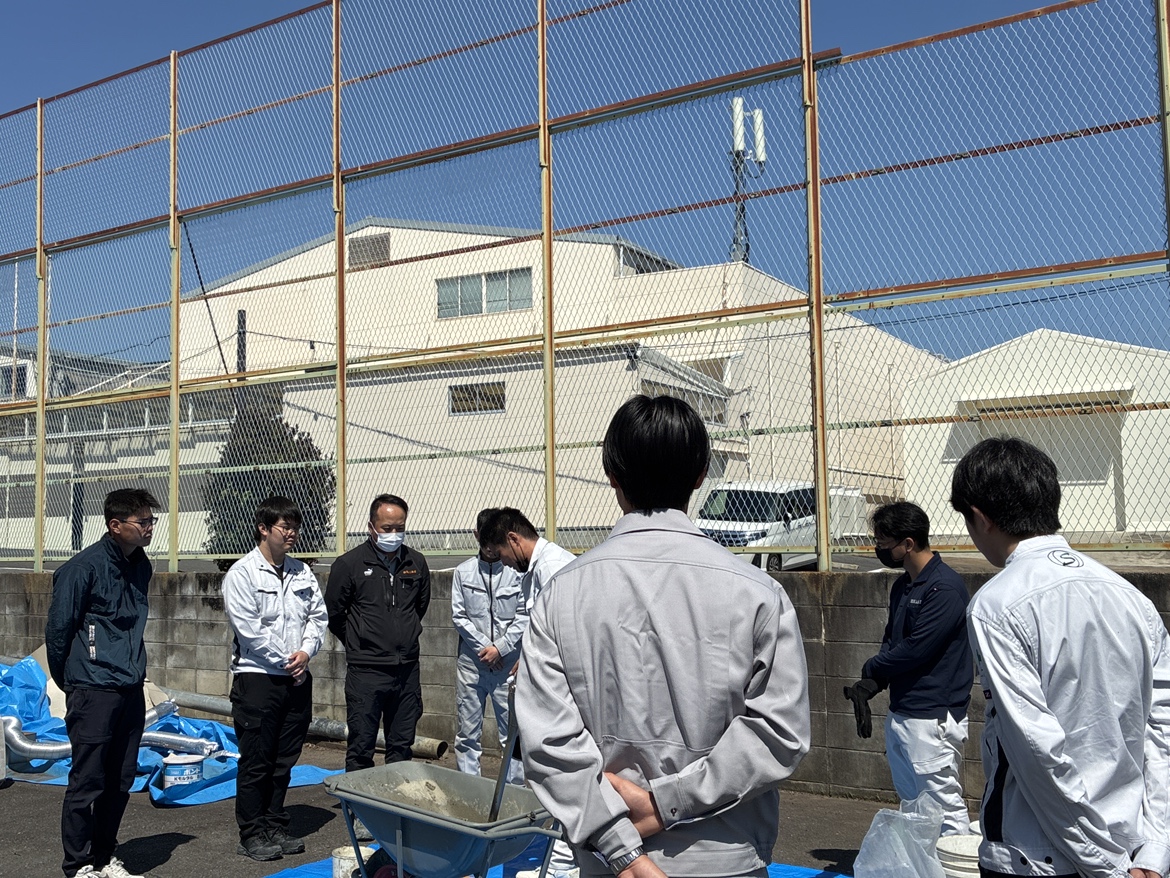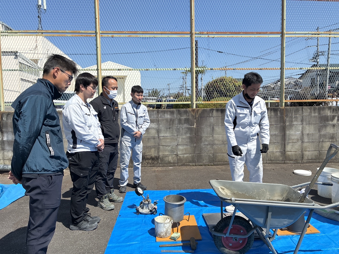 研修では実際に材料を混ぜてコンクリートをつくり、試験を実施。強度試験などを体験しながら、コンクリートの奥深さと重要性を学びました。