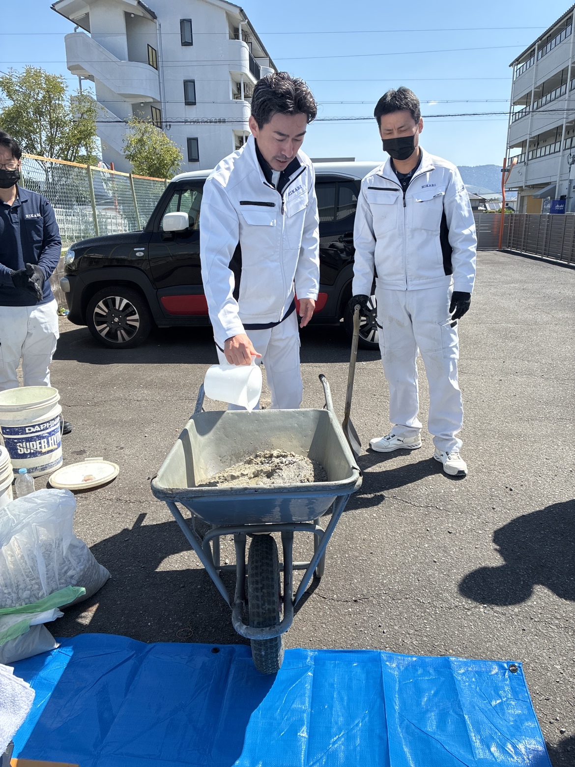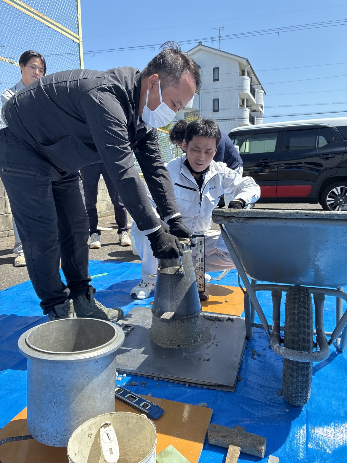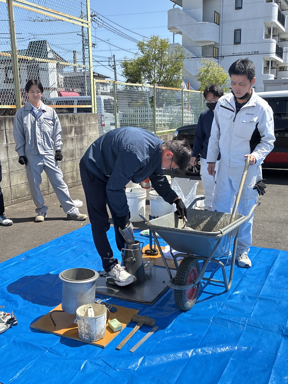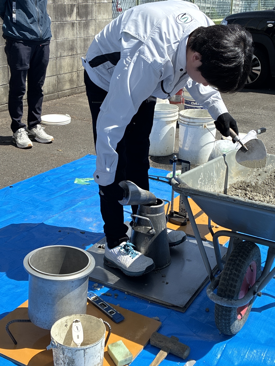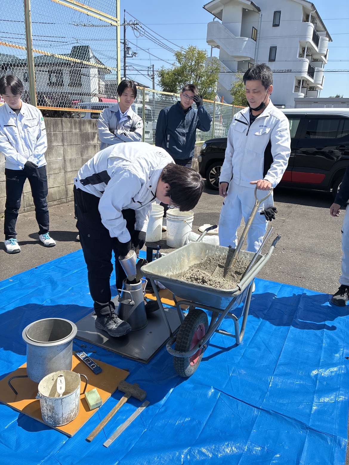 研修では実際に材料を混ぜてコンクリートをつくり、試験を実施。強度試験などを体験しながら、コンクリートの奥深さと重要性を学びました。